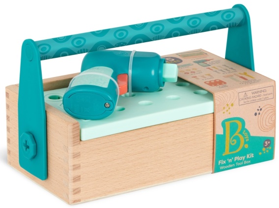 – dzieci mogą udawać, że budują za pomocą narzędzi, takich jak wiertarka „elektryczna”, młotek, śrubokręt lub klucz francuski – nakrętki, gwoździe i śruby pasują idealnie do otworów w pokrywie;