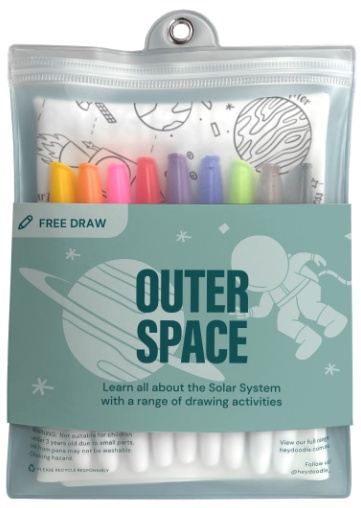 Australijska firma HeyDoodle zaprojektowała opakowania tak, aby było ładne i praktyczne. Maty idealnie sprawdzą się na prezent, a potem w zabawie w domu, w podróży, w samochodzie, u babci i cioci, a po zabawie, można ponownie schować flamastry i matę do estetycznego opakowania.