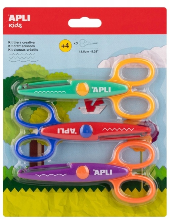 Zestaw zawiera trzy pary nożyczek, każda tnąca w unikalny kształt: zakrzywiony, ząbkowany i zygzakowaty.