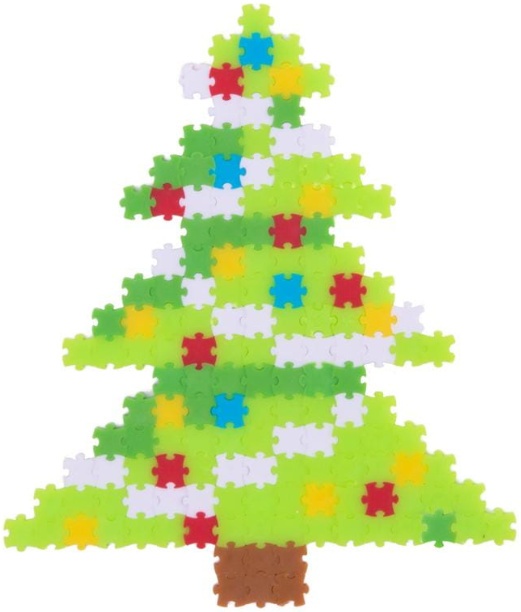 Przezroczysta bombka, którą można powiesić na choince wypełniona jest co najmniej 150 precyzyjnie wyciętymi, puzzelkami pixelkami, z których można ułożyć choinkę, a potem ozdobić nią choinkę i dom.