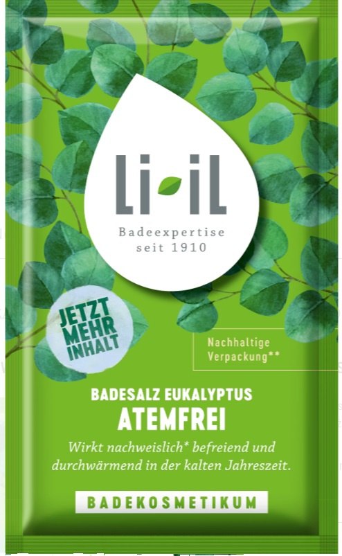 Sól morska i węglan wapnia w połączeniu z olejkiem migdałowym sprawiają, że skóra staje się zauważalnie bardziej miękka i nie wysusza się. W połączeniu z ciepłą wodą olejek eteryczny z eukaliptusa ma długotrwały korzystny, uwalniający i rozgrzewający efekt. Nie dla dzieci poniżej 3 lat.