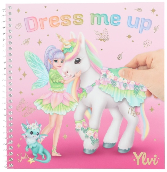 Zestaw Dress Me Up Ylvi jednorożec z naklejkami, 12 dwustronnie zadrukowanych kartek oraz 11 stron z naklejkami (głowami, ubraniami i dodatkami). Wymiary: 1,2x17,5x18cm. Dla początkujących projektantek :) Wiek: 5+.